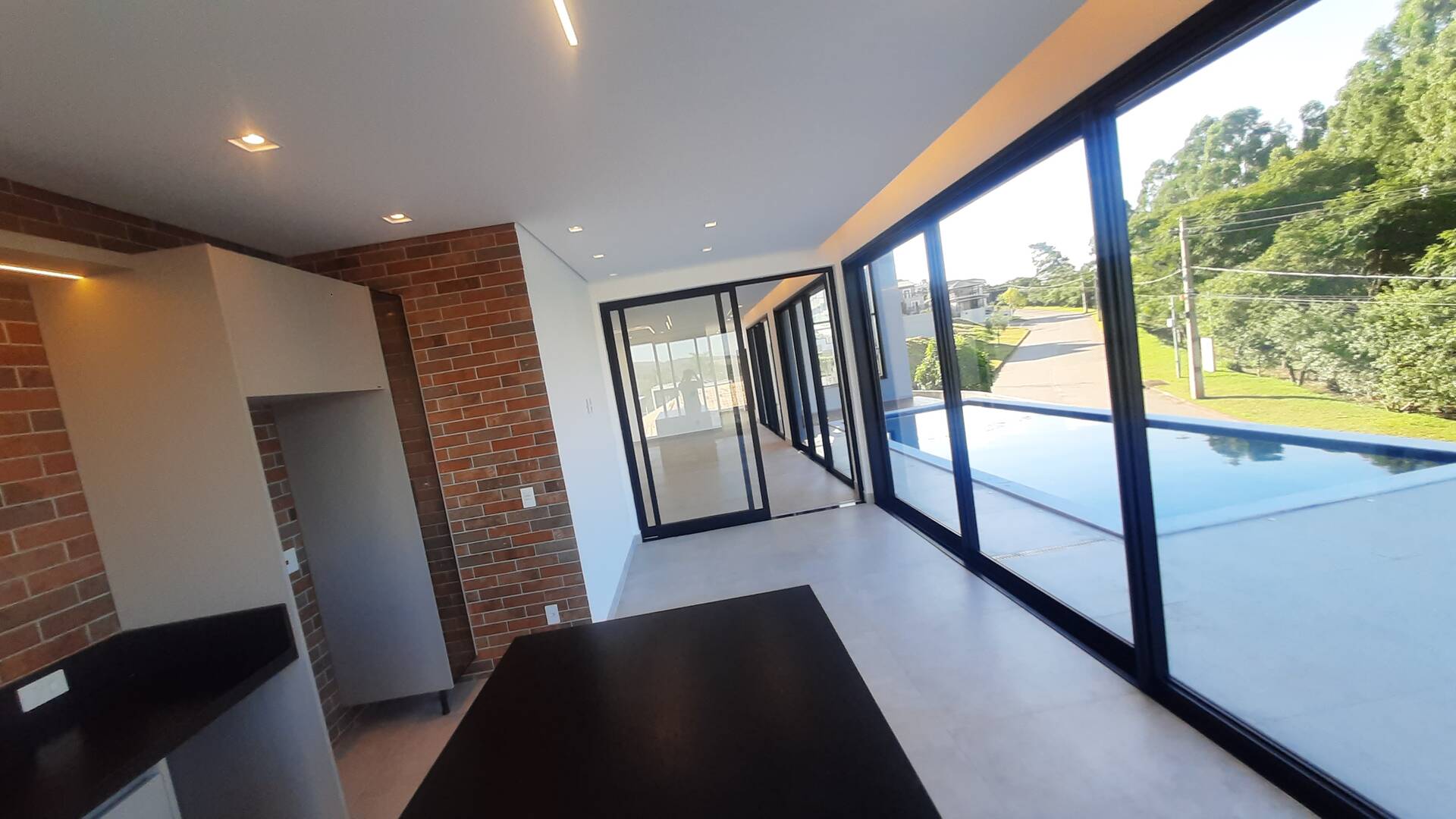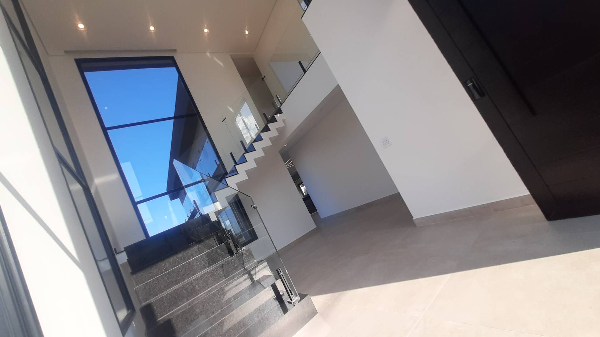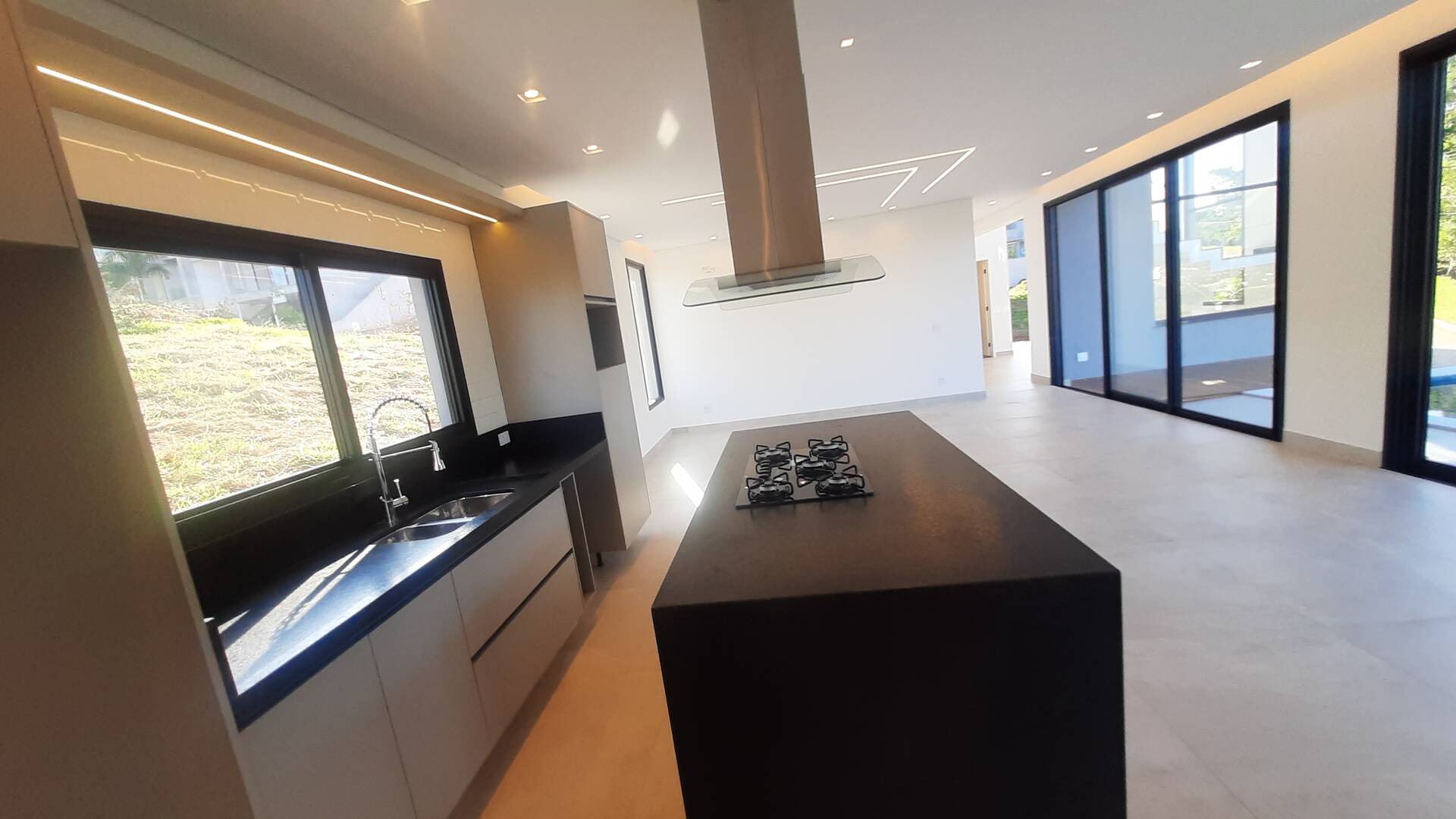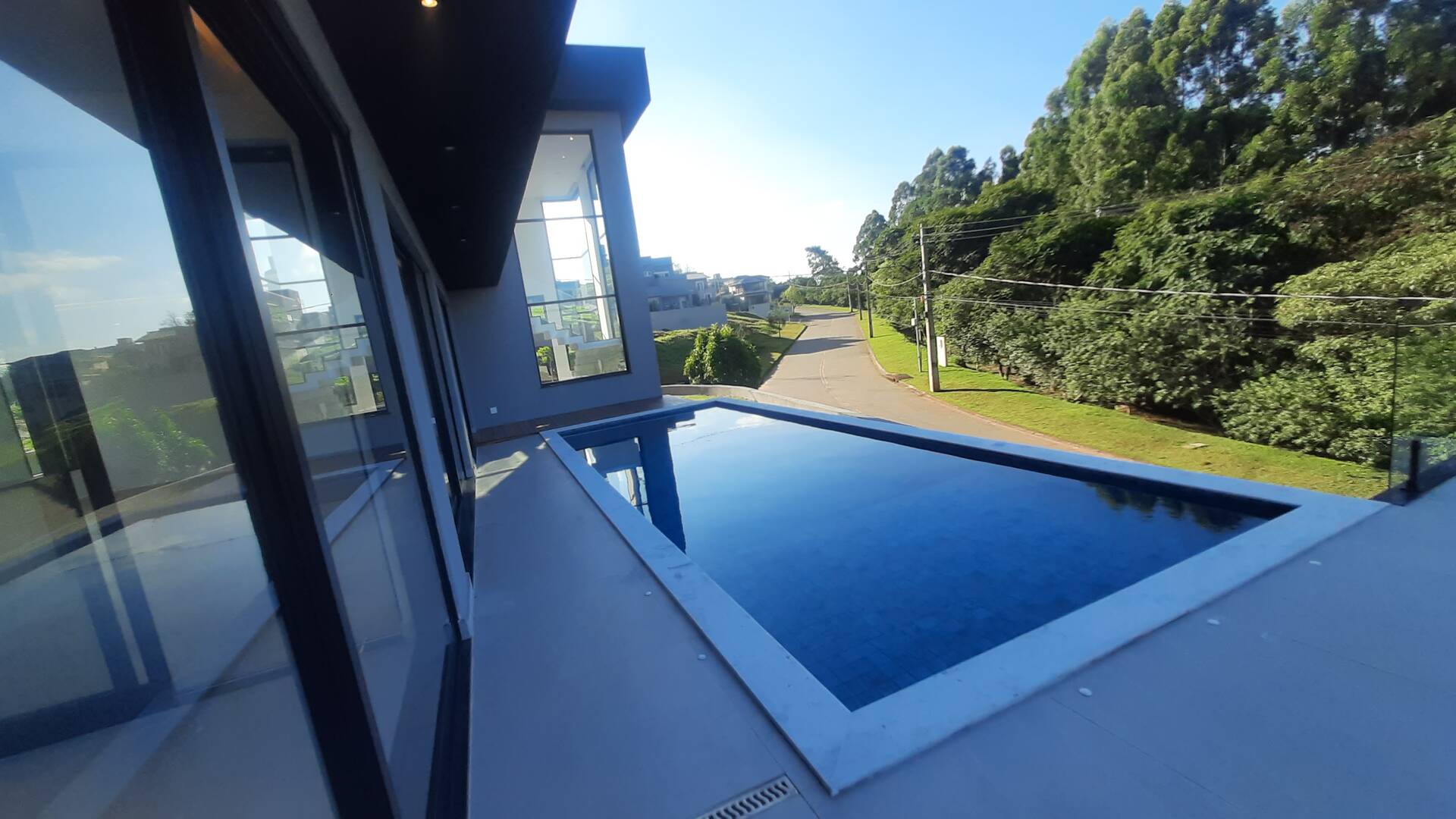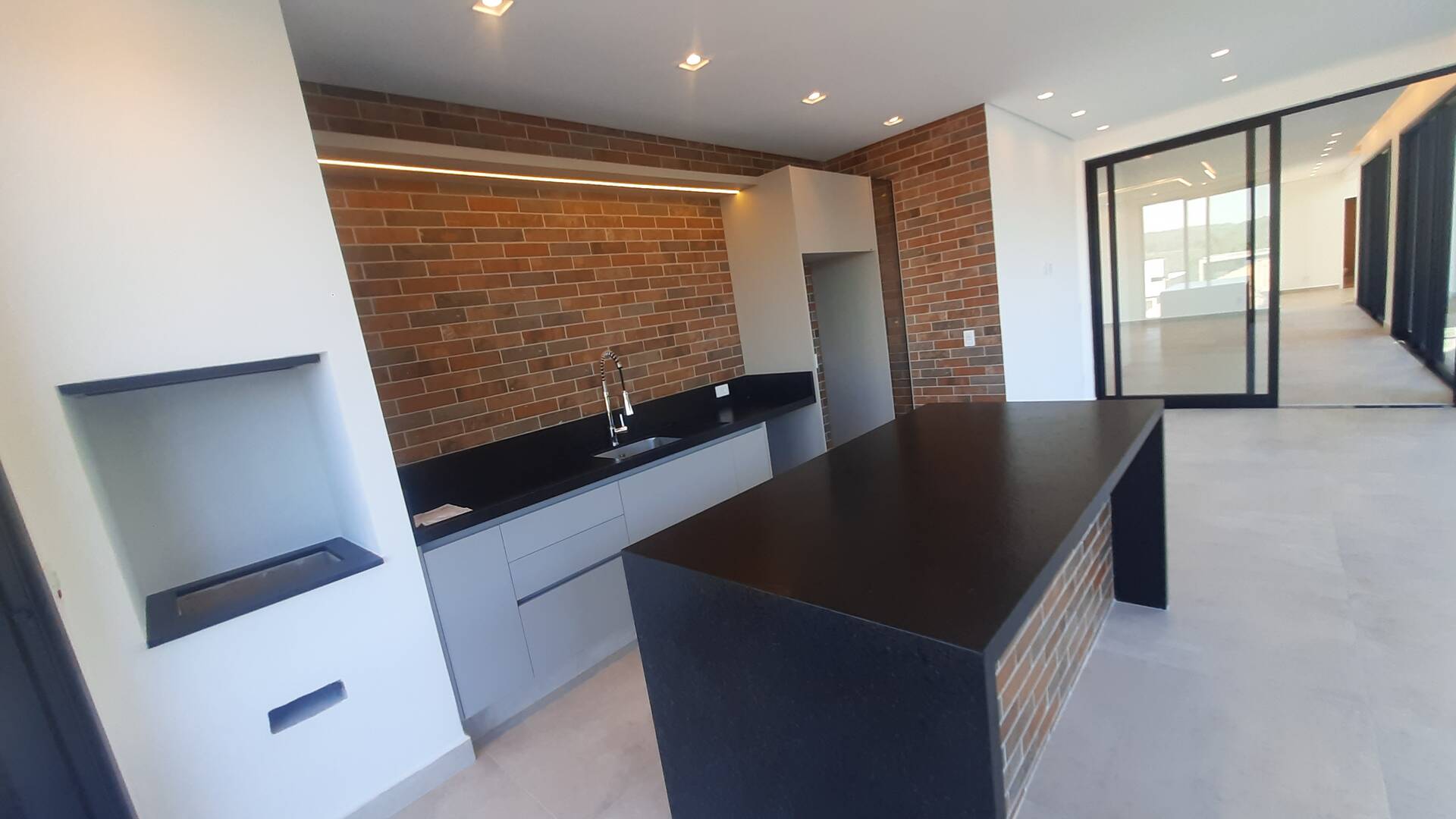 5 suítes, 2 vagas, sala de estar integrada à cozinha, área gourmet e um amplo deck com piscina. A casa conta com acabamentos de alta qualidade, como mármore São Gabriel e esquadrias automatizadas.