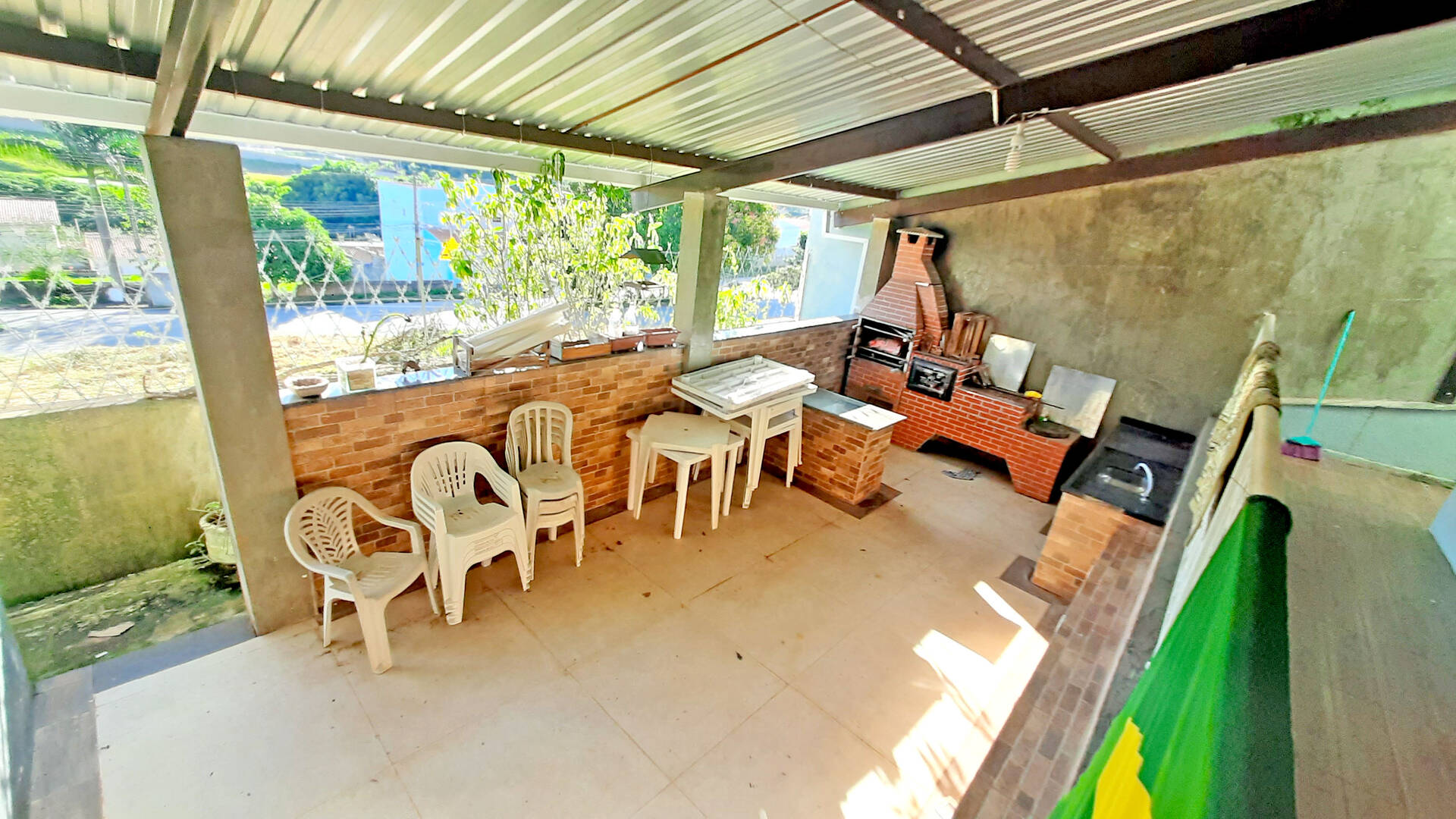 Área Gourmet com churrasqueira, fogão a lenha, pia, bancada de pedra e banheiro social